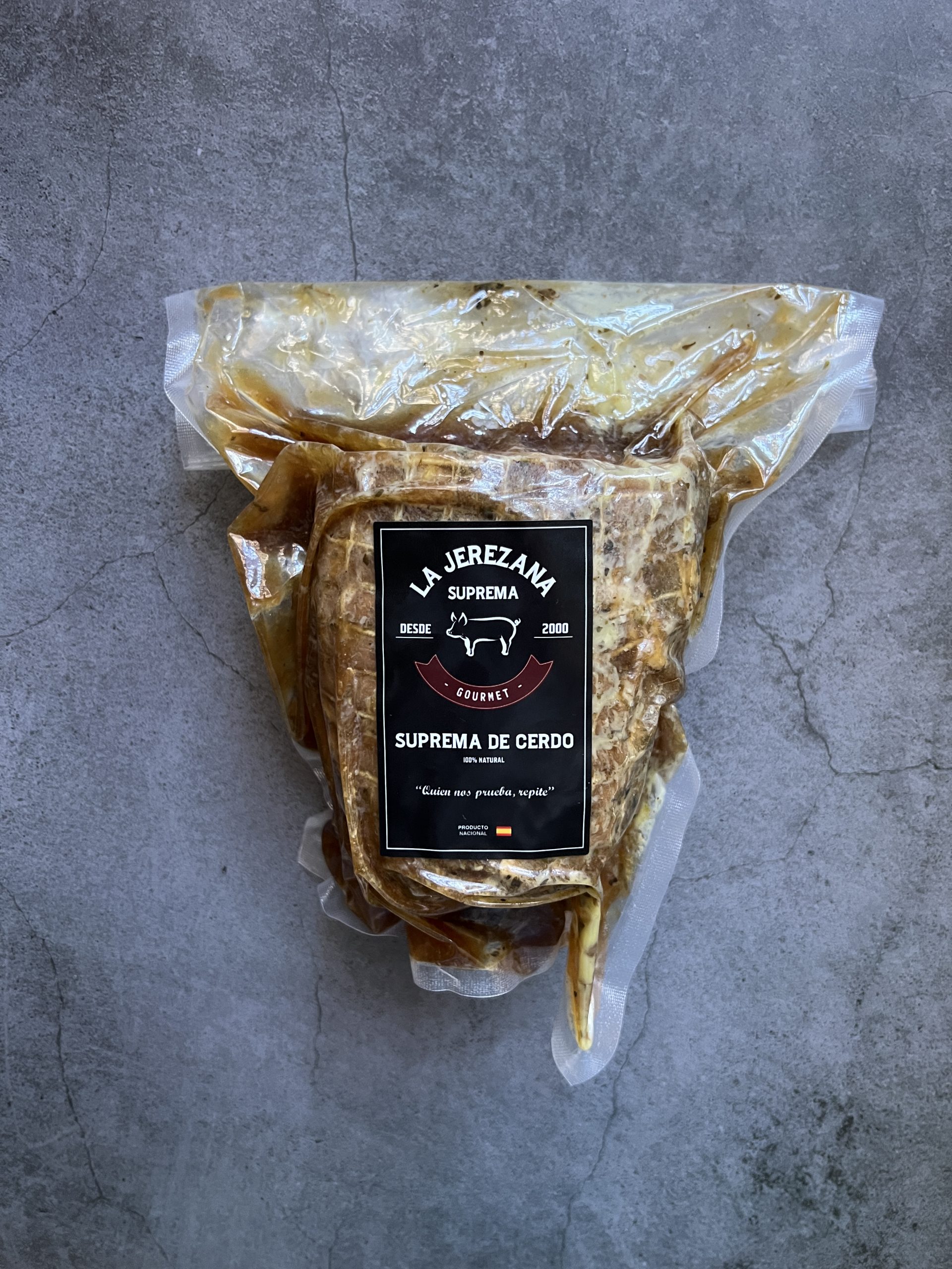 Carne mechada elaborada con la cabeza del lomo del cerdo macerada en especias durante 24 horas, bañada e manteca ibérica y horneada de la forma más tradicional. Una carne muy tierna con un sabor y una textura excepcional, exquisito al paladar. Lista para degustar.